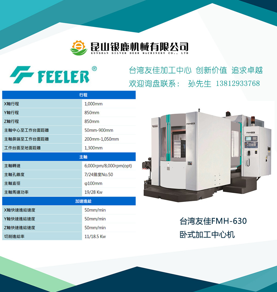 臺灣友嘉FMH-630雙臺面臥式加工中間,設想理念在高效力、不變、重切削之詳細表現。能夠承接模具、大型工件加工。針對普通緊密工件或是模具加工,都可勝任。安定高剛性布局,特別凹凸軌設想,底座接納T型一體式三層箱形布局設想,共同鑄件外部優化的肋骨強化,闡揚機器剛性與不變性;門型兩重壁之立柱布局,剛性安定,保障重切削之需;底座接納凹凸軌設想,有用延長力流線,并且進步加工不變性。任務臺設置裝備擺設大錐面托板定位拉栓,定位緊密、保障加工精度。裝備扭轉式主動互換任務臺,最大荷重1200KG,任務臺最大直徑950mm,最快互換速率10秒。鏈條式刀庫,60、80、90、120刀位備選。